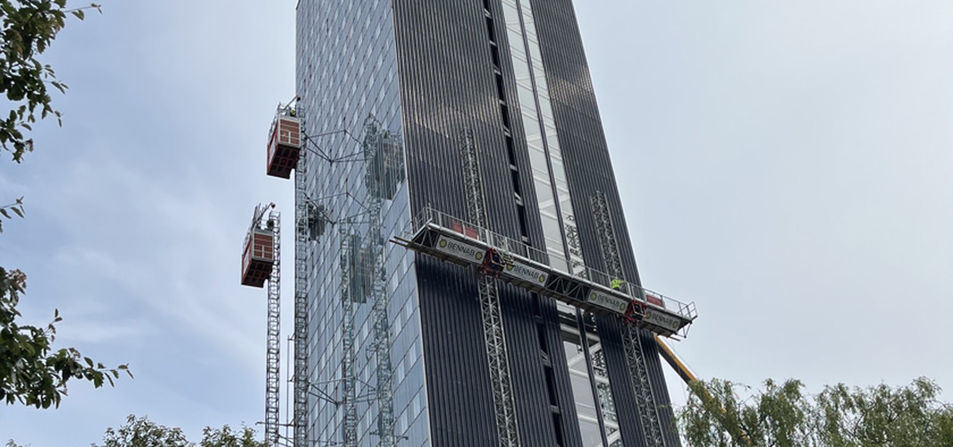 Two twin legacy MSHF mast climbing work platforms were also installed, providing a 19.2 m wide platform, which was used to assist in the installation of the new façade panels.