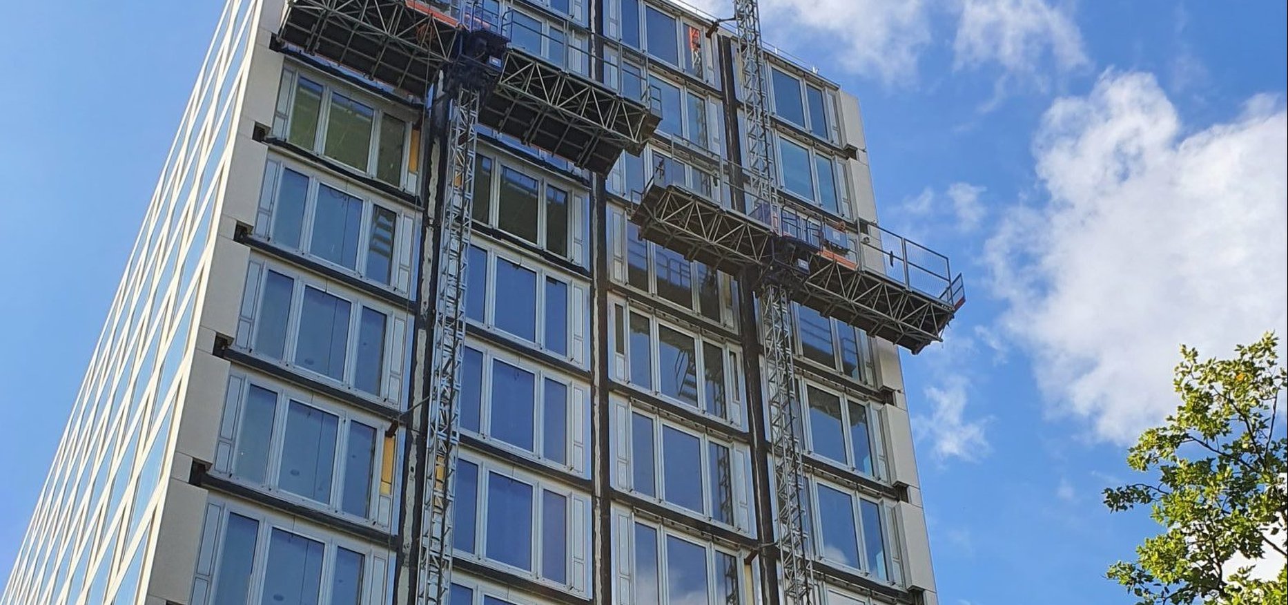 Alimak wurde gebeten, eine effiziente vertikale Zugangslösung für die Montage der neuen Fassadenelemente und Fenster des DGB-Gebäudes zu liefern.
