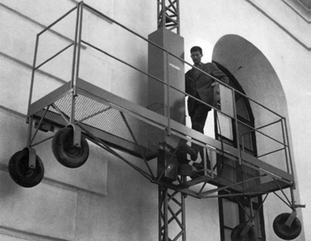 Mastkletterarbeitsbühnen werden verwendet, um Arbeiter, Ausrüstung und Materialien zu und von einem einzigen Einstiegspunkt zu transportieren. Mastkletterbühnen sind aufgrund ihrer eingeschränkten Funktion nicht für den Einsatz als Bauaufzüge konzipiert.