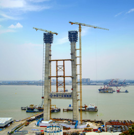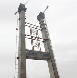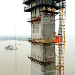 Beim Bau der Brückenpylonen in Wenzhou City, Zhejiang, China, wurden zwei Personen- und Materialaufzüge des Typs Alimak SC 45/30 eingesetzt. Mit einer Tragfähigkeit von 2.000 kg, einer Förderhöhe von 150 Metern und einer Neigung von 1,5 Grad zu den Pylonen ermöglichten die Aufzüge einen effizienten Höhenzugang während der Beton-Gleitschalungskonstruktion der Brückenpylonen.