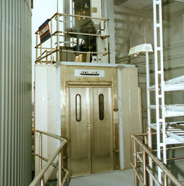 Bei dem Aufzug am Fermenter handelt es sich um einen ALIMAK SE-5, der ohne Aufzugsschacht extern installiert wird. Er hat eine Förderhöhe von 61 m und eine Geschwindigkeit von 0,7 m/s. Der Fahrkorb aus Edelstahl hat eine Tragfähigkeit von 500 kg. Um Instrumente und Prozesse zu überwachen, undichte Rohrverbindungen usw. zu reparieren, ist ein häufiger Zugang zu verschiedenen Ebenen der beiden Bleichtürme der Skoghall-Fabrik erforderlich. Die 50 m und 56 m hohen Bauwerke sind mit externen Zugangsaufzügen mit Fahrkörben aus Edelstahl ausgestattet. Sie sind etwas größer als der Fahrkorb auf dem Fermenter und bieten Tragfähigkeiten von 1.000 kg und 1.200 kg. Der vierte Alimak-Aufzug wurde im Jahr 1994 installiert und dient einem Gebäude für grüne Laugenfilter. Er verfügt über eine Förderhöhe von 21 m.