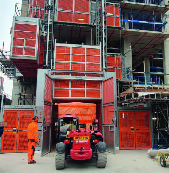 Hay cinco montacargas de obra Alimak trabajando en el proyecto de desarrollo de South Quay Plaza 4. Un Mammoth de doble mástil, un Scando 650 XL FC-S y un Scando 650 FC están instalados en una configuración Triplex, dando servicio a 55 paradas hasta 190 m.